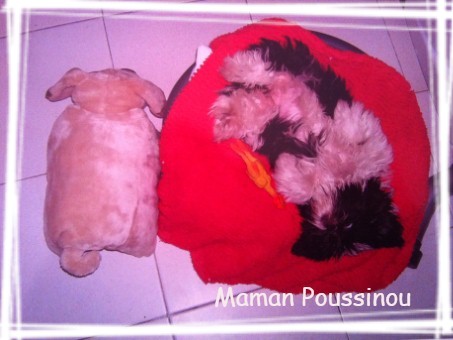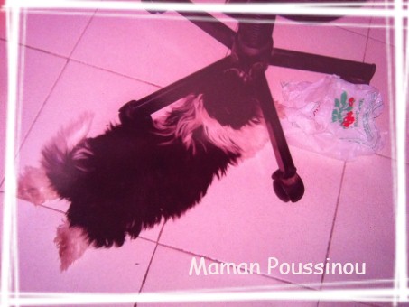 Et puis elle a un peu grandi, tout en restant petite, elle est plus petite que les autres Shih-Tzu. Elle a son petit caractère à elle et sait bouder par moments. Sinon, c’est un chien très joueur, elle adore faire des bêtises, voler les kleenex et les déchiqueter, machouiller tout et n’importe quoi (je ne vous parle pas de l’interphone mangé avant même d’être installé (elle l’avait pris dans le placard), le bâti de la porte de cuisine, celui de la porte des toilettes, et j’en oublie…). C’est un chien qui n’aboie pas (sauf quand elle est avec son copain Zozore, le chien de mes parents qui lui ne fait qu’aboyer). C’est un chien très câlin, j’ai passé mon congé maternité pré-accouchement avec Kiki en boule sur mon ventre et Poussin qui se donnait à coeur joie de lui montrer sa présence in-utero.