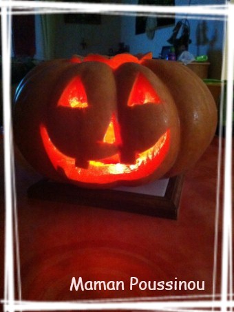 Du coup, nous sommes allés acheter notre « citrouille » pour Halloween et c’est bizarre, mais maintenant j’ai les mains toutes oranges, ça me donne un style…. Et je suis super contente !! C’était ma première citrouille, j’ai toujours voulu en décorer une ! Poussin est ravi et moi aussi, en plus, ce soir, il y aura de la soupe maison (comme tous les soirs en ce moment) mais cette fois, à la citrouille 🙂