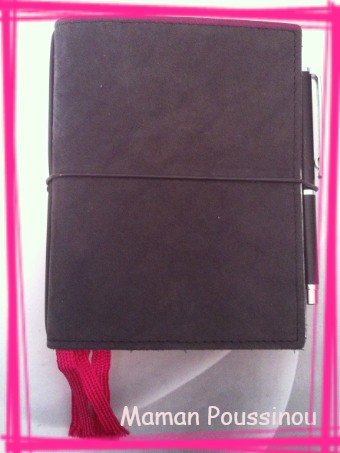 Et je ne m’attendais pas à ce qu’ils m’offrent celui avec la couverture en cuir effet peau de pèche, le petit stylo qui va avec et les carnets qui vont bien… Alors il est noir, il est tout petit (format A7), mais ça me suffit largement pour noter nos rendez-vous, anniversaires, fêtes, et tout ce que j’ai à y écrire, et j’y ai ajouté quelques touches de couleurs pour qu’il me corresponde totalement. En plus il est super pratique avec son système d’élastiques pour tenir les carnets et le fermer. Je l’adore mon agenda !
