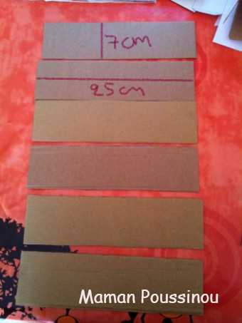 -> Pour les étagères et le dessous : coupez 6 rectangles de 7×25 cm comme sur la photo :