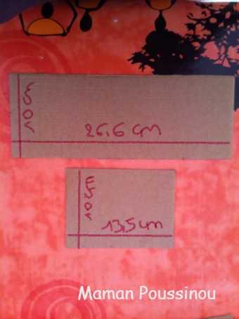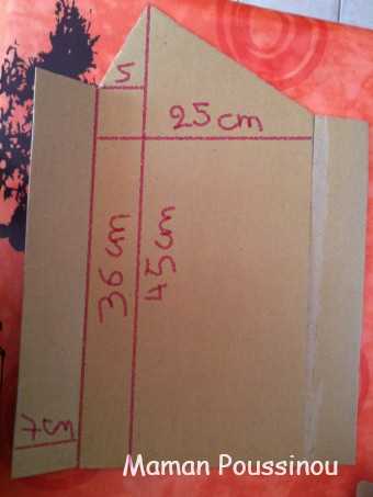 Couper un carton aux dimensions indiquées sur le dessin puis pour les côtés, 2 rectangles de 7×36 cm