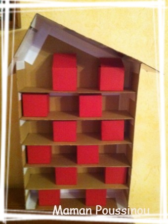 J’ai réalisé la maison et la moitié des boîtes hier après midi pendant la sieste de Poussin (il me manque 12 boîtes qui viendront là où il y a les espaces).