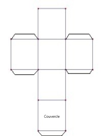 Voici un patron pour les réaliser. J’ai voulu des boîtes de 5 cm de côté. Une fois la forme découpée, pliez selon les traits. Puis collez au niveau des languettes (prévoir 1 cm) (sauf celle du couvercle). Voici le résultat :