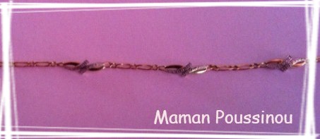-> Ce bracelet, cadeau de notre 1er anniversaire de mariage et qui ne quitte jamais mon poignet. D’ailleurs, à l’autre poignet j’ai la gourmette de Poulet et lui a la mienne depuis que nous sommes ensemble.