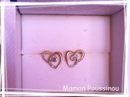 -> Mes boucles d’oreille, avec de tous petits éclats de diamant, offertes à la St Valentin qui a suivi la naissance de notre Poussin. J’avais lu quelque part, mais je ne sais plus où, qu’après la naissance d’un enfant, la coutume veut qu’on offre un diamant à la maman. Si si, je vous jure, je l’ai même pas inventé !!!