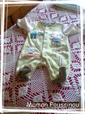 Avant l’arrivée de Poussin je m’étais fait plaisir en achetant pas mal de petites grenouillères trop mimis, taille naissance et un mois…. Avec le recul, j’ai quand même eu de la chance qu’il puisse mettre la taille naissance quelques semaines.