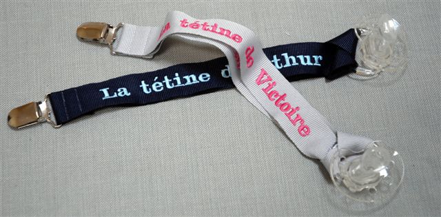 ou encore ces accroche-tétine personnalisables au nom de l’enfant (parce que Poussin n’arrive pas encore à se débarrasser de cet objet de malheur …)