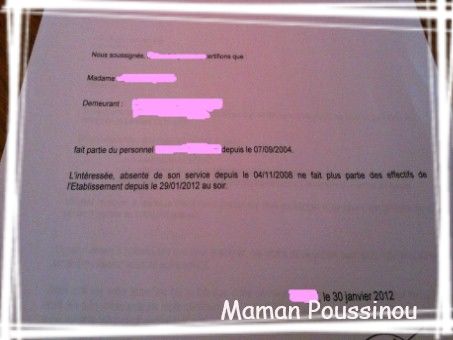 Puis, quand le courrier de confirmation de rupture de contrat est arrivé vendredi, j’avoue que j’ai lu cette phrase avec un petit pincement au coeur, même si c’était mon souhait : » L’intéressée, absente de son service depuis le 04/11/2008 ne fait plus partie des effectifs de l’Etablissement depuis le 29/01/2012 au soir. »