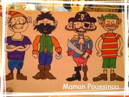 Dessiné sur une feuille Canson beige, il suffit de coller la tête sur un petit bout de papier rectangulaire et courbé, puis de coller le tout sur le torse du pirate.