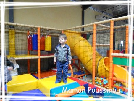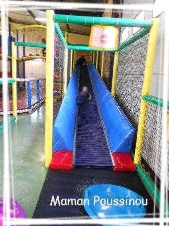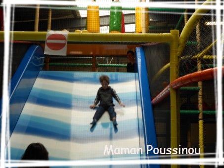 Là bas, où nous sommes déjà allés 3 ou 4 fois, nous avons vraiment pu voir l’évolution de notre Poussin. Déjà, il ne s’est pas limité à l’aire de jeux des 0 – 3 ans, mais il s’est aventuré un peu partout…. grand toboggan, parcours un peu aérien (pour lui qui semble avoir le vertige, j’ai trouvé que c’était un bel exploit), trampoline, « piste de luge »… Il a vraiment apprécié et nous aussi, surtout que pour une fois, il ne s’est pas fait mal et ça, ce n’est pas négligeable !!! (Au cas où, nous avions quand même dans le sac, les granules d’arnica…)
