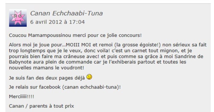 Merci pour ce concours. Je rêve de gagner ce joli carnet pour consigner mes souvenirs des premiers jours (j’adore tout noter!) et pour m’aider à me souvenir des heures de chaque têtée (ça me changera des 15000 feuilles volantes pour mon premier allaitement!)