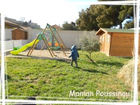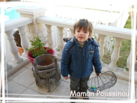 Ni une, ni deux, Poussin excité va chercher son manteau (il y avait du soleil mais un mistral assez fort et casse pied…) et c’est parti pour la chasse aux oeufs !