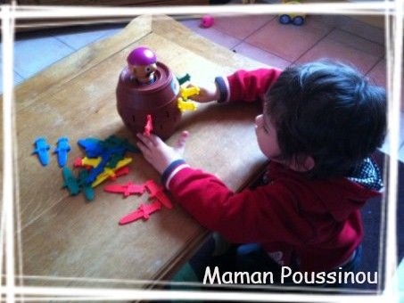 Avec Pic Pirate, ce qui l’éclate forcément, c’est de voir le pirate sauter de son tonneau… Il rigole à chaque fois. Et pour être sur que ce soit lui qui le fasse sauter (il n’a pas encore compris la règle…) il triche bien souvent et joue à notre place. Nous forcément, ça nous plaît tellement de le voir si heureux qu’on se contente de se regarder et d’apprécier le moment présent.