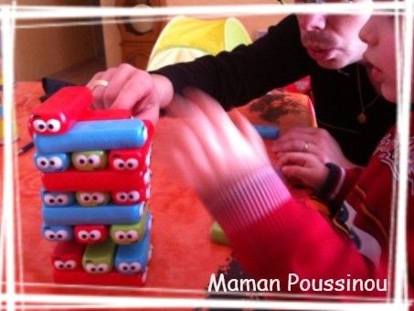 Le 2ème jeu, c’est un peu le jeu de la tour infernale, une fois installée, on lance un dé qui indique la couleur de la brique à enlever, sans faire tomber toute la tour ! Et bah Poussin est super fort à ce jeu ! Déjà il connaît les couleurs (et là c’est facile il n’y en a que 3), et puis il s’applique vraiment pour sortir LA brique qu’il a choisie sans faire tomber le reste.