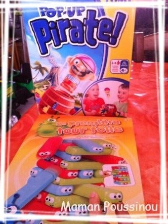 Un samedi matin, avec Poulet, nous avons eu une idée (oui ça nous arrive parfois), et si nous achetions des « vrais » jeux de société où nous pourrions jouer tous les 3 (ou à 2). C’est ainsi que nous avons fait l’acquisition de 2 jeux que Poussin adore : Pic Pirate, super connu… Et Ma première tour folle, « la tour rigolote » comme dit Poussin.