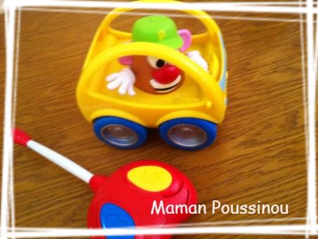 C’est une petite voiture avec au volant le célèbre personnage à la tête rigolote du dessin animé Toy Story, Monsieur Patate. Grâce à la télécommande, la voiture avance, tourne sur elle-même et fait même des roulades avant. Tout ça avec des bruitages.