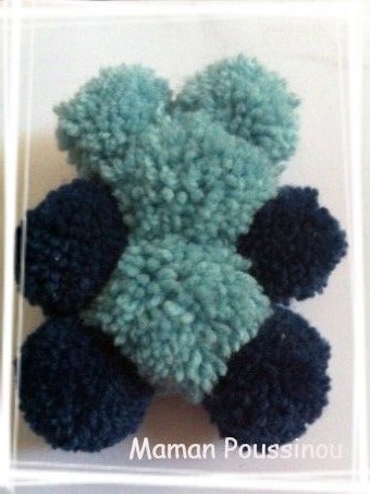 Alors pour faire un petit nounours, ou un gros, il faut faire 2 gros pompons et 6 plus petits. J’ai utilisé des restes de laine de la couverture de Poussinet.