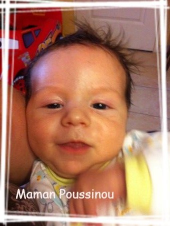 Poussinet est un beau bébé qui passe ses journées et ses nuits à téter (presque), aussi bien pour se nourrir que par plaisir du contact et des câlins. Mais c’est aussi un bébé qui gazouille et sourit beaucoup, il n’arrête pas de « discuter » avec sa Maman, joue avec les peluches qui pendent de son transat, tape dedans, leur parle aussi à coup de areuh, les attrape,…