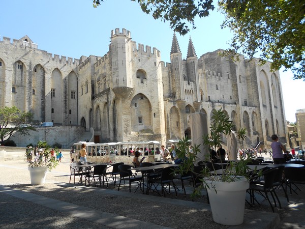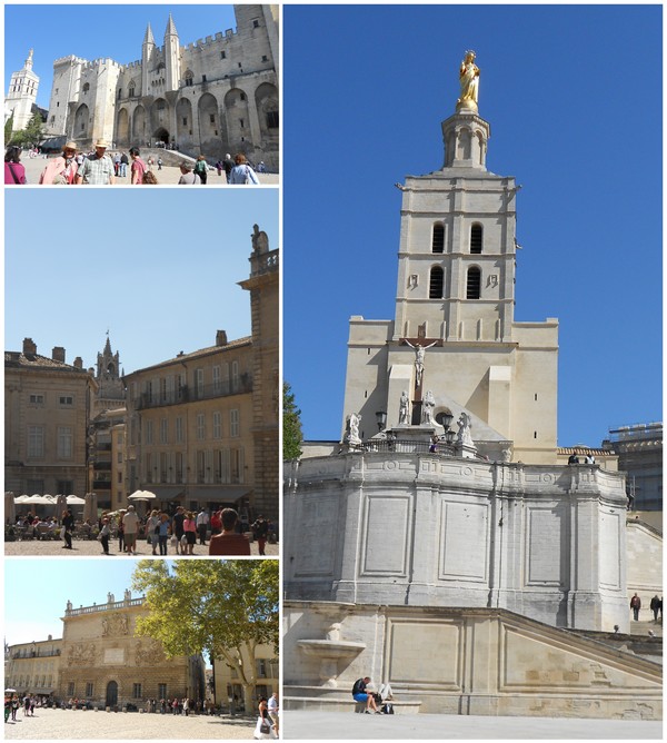 -> La place du Palais, avec le Palais des Papes, la maison Jean Vilar, le clocher de l’église St Pierre et l’Hôtel des Monnaies