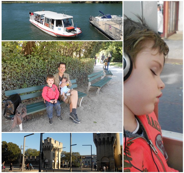-> La navette qui permet de traverser le Rhône, mes 3 Amours, la porte de la République et un morceau des remparts, un Poussin qui a bien trotté toute la journée et qui s’est endormi dans le petit train…