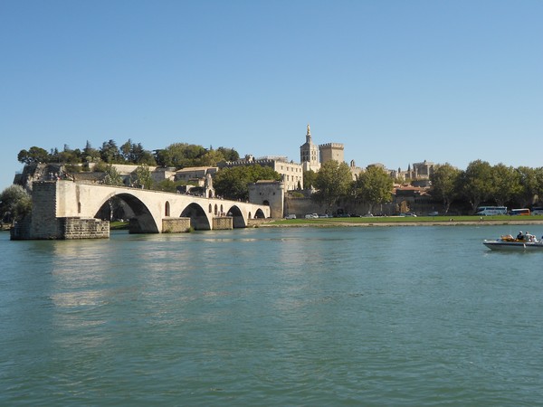 -> Le Pont Saint-Bénezet (le célèbre Pont de la chanson) et le Palais des Papes, vus depuis l’île de la Barthelasse