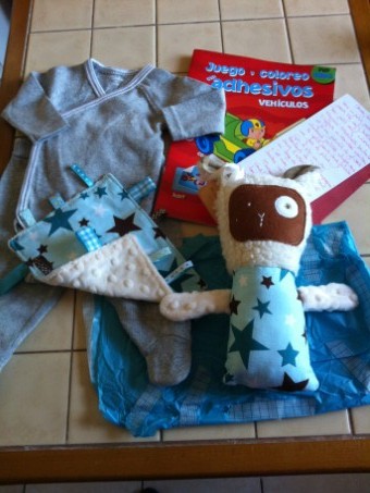 Un doudou étiquettes, un body avec des collants assortis et un livre d’activités sur les véhicules, en espagnol, qui a de suite ravi Poussin (qui a eu du mal à me le laisser pour que je prenne la photo).