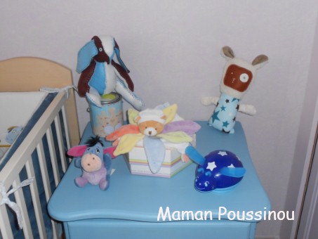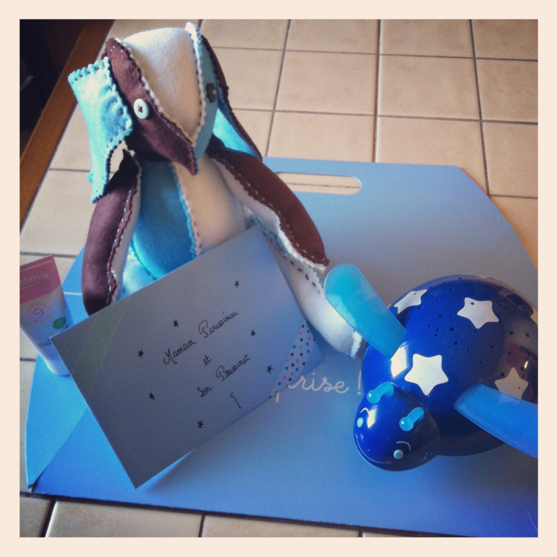 Elle nous a offert la veilleuse Bee Happy de Pabobo, une crème allaitement pour soigner mes seins qui en ont bien besoin vu comme ils sont sollicités à longueur de journée, un lapin en feutrine qu’elle a elle même réalisé, une grande 1ère, rien que pour Poussinet, même qu’il est très beau !
