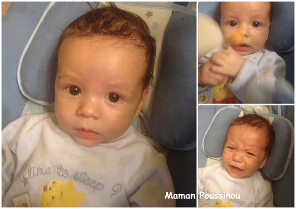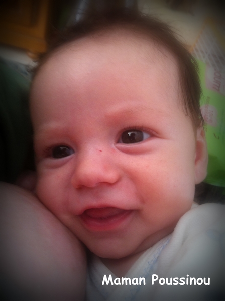 Mais mon Poussinet ne fait pas que pleurer, il sourit aussi, et à la demande s’il vous plaît ! Quand je l’appelle « mon bébé d’amour », il me sourit, me regarde, me « parle ».