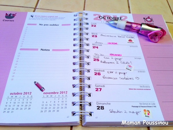 Quand je travaillais, je n’ai jamais rien noté, préférant tout avoir dans la tête : codes de connexion au serveur, codes divers et variés pour accéder aux sites, les tâches que je devais accomplir,… Quand Poussin est né, je n’ai pas non plus ressenti le besoin d’avoir de quoi noter notre planning, je ne travaillais plus, c’était facile. Mais je n’étais pas organisée pour autant.