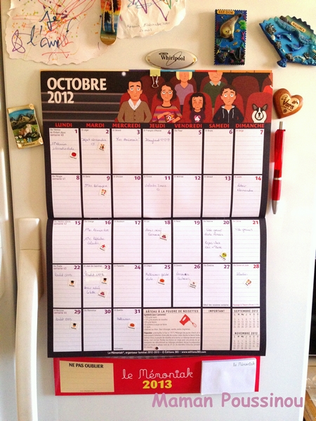 J’ai aussi accroché sur mon frigo, le calendrier familial où j’ai tout le mois sous les yeux en 1 seul coup d’oeil. Je vois ainsi tous les anniversaires et ai le temps de prévoir à l’avance les sorties. J’y suis accro aussi !
