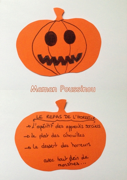 J’ai dessiné une citrouille (selon un modèle de coloriage trouvé sur le net) sur du papier de couleur orange, l’ai découpée et j’y ai noté le repas du soir d’un côté et lui ai fait des yeux, un nez et une bouche de l’autre côté.