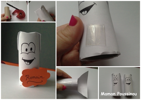 Réalisés avec des rouleaux de papier toilette vides. Nous n’avons pas eu le temps de les peindre en blanc, alors je les ai recouverts de papier, fermé par un morceau de scotch derrière, sur lesquels j’ai dessiné des yeux au feutre noir et collé une étiquette avec nos prénoms.