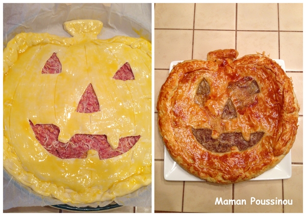 Une tourte-citrouille à la viande, idée de la forme citrouille trouvée ici. Pour la recette, la voici :