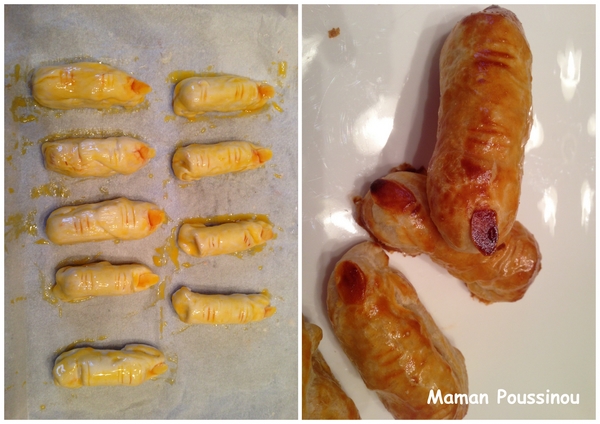 Un classique que je connais depuis des années et qui fait son petit effet ! On coupe un rectangle de pâte feuilletée, on badigeonne d’un peu de moutarde (ou de ketchup comme ici) on pose un morceau de saucisse rouge, on roule la pâte sur la saucisse et on referme bien. On fait des traits au couteau pour représenter les phalanges, on met une amande effilée au bout pour faire l’ongle. On met un peu de ketchup sur les traits faits au couteau et l’ongle. On badigeonne de jaune d’oeuf et on enfourne 20 min à 180°C (th 6).
