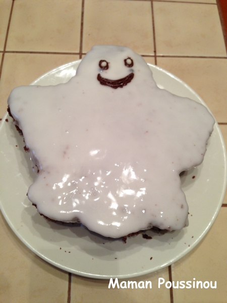 Un gâteau au yaourt au chocolat, toujours la même base, sur lequel j’ai posé un gabarit de fantôme que j’ai imprimé sur internet. J’ai découpé en suivant le gabarit puis j’ai réalisé un glaçage au sucre (200g de sucre glace, un blanc d’oeuf et le jus d’1/2 citron) et fait les yeux et la bouche au crayon à pâtisserie parfum chocolat.