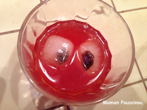 Sur une idée trouvée sur le net, de la boisson gazeuse couleur rouge et des yeux réalisés en mettant un raisin sec dans chaque compartiment d’un bac à glaçon, on remplit d’eau et on met au congélateur.