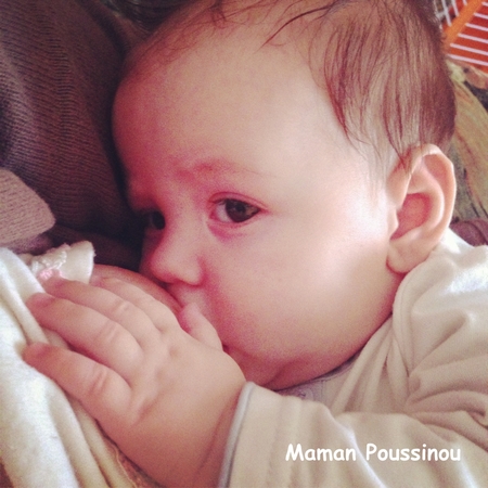Il aime toujours autant se blottir contre ma poitrine, s’y cacher pour faire le coquin. Et moi, je suis contente de toujours l’allaiter, je commence même à me poser de moins en moins de questions. Nous continuons notre expérience à deux ou plutôt à quatre car tout le monde participe. Poussinet est une petite crevette qui pèse 5.8 kg mais qui est un véritable petit glouton mignon. Il n’y a qu’à voir ses bonnes joues (et son double-menton) pour s’en rendre compte.