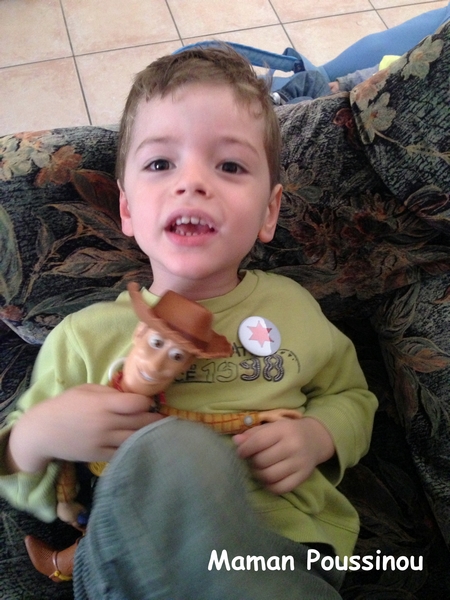 Il a tout de suite compris de quoi il s’agissait et m’a demandé de lui en attacher un sur le pull. Il a choisi l’étoile, « pour être un vrai shérif » et a attrapé son Woody qui trônait sur la table basse (quand je vous dis qu’il est à fond !).