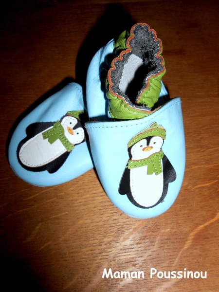 Je joue pour les mêmes chaussons que Poussinet, d’une part parce que j’adore le bleu et d’autre part parcequ’ils portent le nom de mon bébé !! Martin le pingouin…