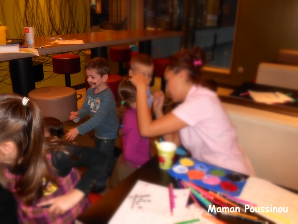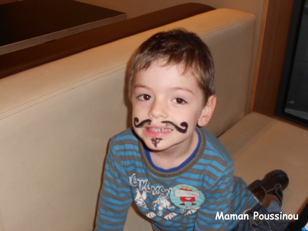 J’ai pu découvrir mon Poussin en compagnie des autres enfants depuis son entrée à l’école et j’avoue que j’ai été surprise. Très agréablement surprise ! Figurez vous que Poussin a été le plus sage de la fête ! Il est resté assis, a dessiné bien volontiers, a couru quand il fallait courir, a bien mangé, s’est laissé maquiller, prendre en photo, et n’a même pas essayé de piquer les cadeaux de sa copine.