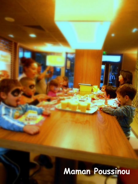 Nous voilà donc arrivés à Mc Do, avec un peu de retard (bizarrement, depuis que je suis maman, j’ai beaucoup de mal à être à l’heure et pourtant je ne supporte pas le retard…) où quelques enfants sont déjà là, à crier et courir dans tous les sens. A ce moment precis, je n’ai pu m’empêcher de penser que 1h30 ça allait être long, d’autant que je m’étais proposée de rester avec mon amie (la maman de la copine qui fêtait ses 4 ans) afin de surveiller les monstres.