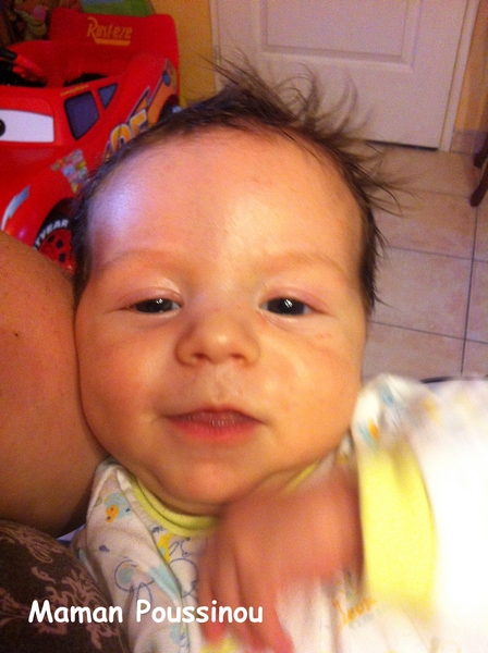 Pareil ici aussi =( Grenouille était un peu moins chevelu que Poussinou à la naissance mais il a fini par tout perdre (ou presque) maintenant il en a que sur le dessus du crâne, c’est bien long puisque ça lui va presque dans les yeux mais sur les coter et derrière y’a presque rien!