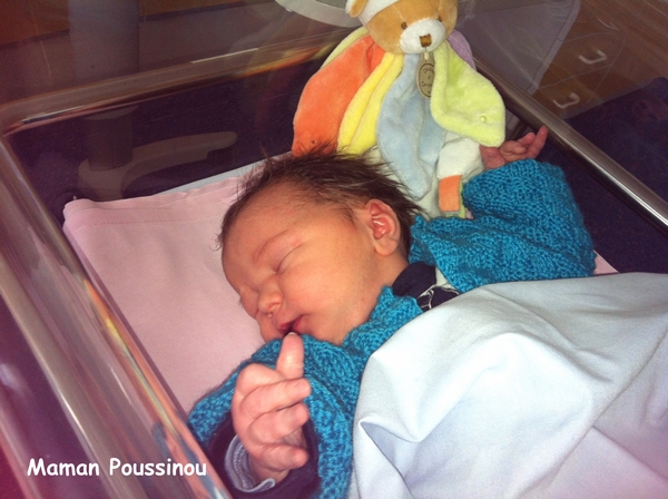 Quand il est né, mon petit Poussinet était bien chevelu, comme son frère. Ses cheveux, c’était un peu une obsession pendant ma grossesse, obsession que je ne saurais expliquer, ça ne m’avait pas effleuré l’esprit pour Poussin… J’avais même demandé au Dr Gygy s’il en voyait à l’échographie du dernier mois. Il avait pu me rassurer de suite en me montrant plein de petits points blancs à l’endroit des cheveux. Et ça s’était confirmé le jour où je l’ai porté dans mes bras pour la première fois… une vraie moumoute, des cheveux, beaucoup, bruns.