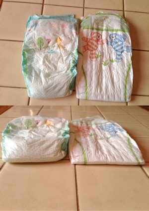 A gauche une couche Pampers, à droite une couche Lidl (taille 3, 4-9kg toutes les 2)