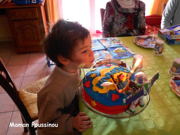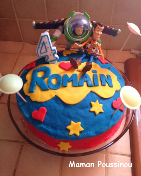 Je vous en parle depuis quelques jours jeudi dernier, Poussin mon grand garçon a eu 4 ans. Pour fêter ça dignement, comme à mon habitude j’ai cherché un thème notamment pour le gâteau. J’avais déjà fait le thème des animaux de la ferme pour son 1er anniversaire, un petit train pour ses 2 ans (vous pouvez voir les photos des 2 gâteaux ici), un gâteau bateau pirate pour ses 3 ans, il me fallait quelque chose de différent. Comme il est fou de Woody, Buzz l’Eclair et de Mr et Mme Patate, le thème de son goûter d’anniversaire ne pouvait être que Toy Story.