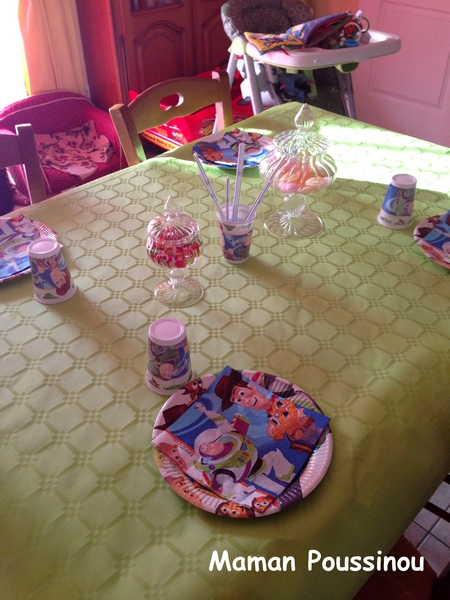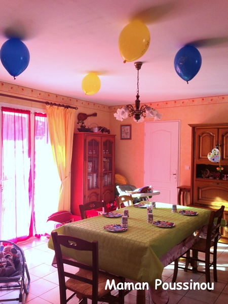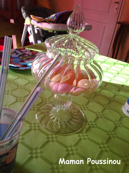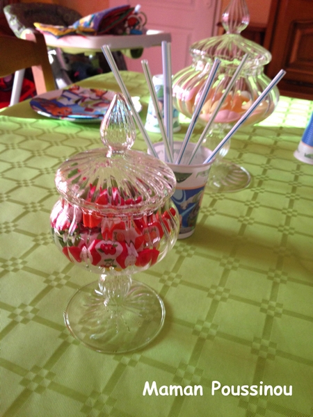 Au départ, je voulais faire une jolie sweet table comme on en voit partout et puis nous n’étions que 5 (+ Poussinet, ne l’oublions pas) alors j’ai abandonné l’idée, je ferai ça l’année prochaine certainement en espérant qu’il me donne des prénoms de copains et copines à inviter !!