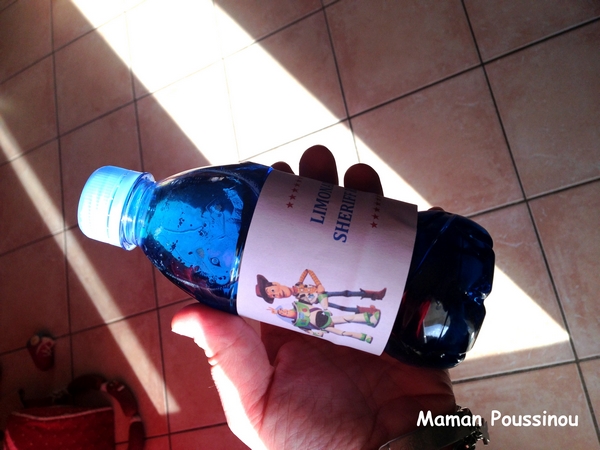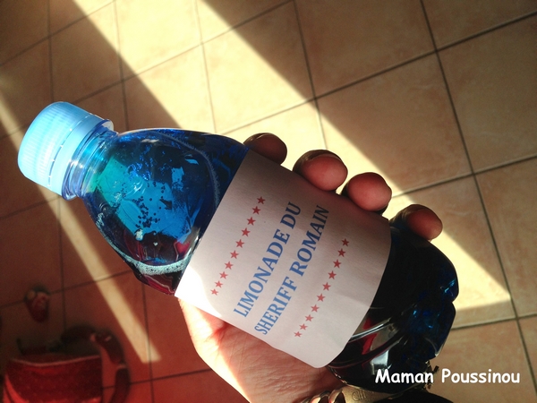 Une étiquette de bouteille personnalisée : un dessin, un texte, on imprime et on scotche  tout simple mais Poussin était bluffé (c’est beau à cet âge !). J’avais aussi mis quelques gouttes de colorant bleu dans sa limonade… J’ai eu la main un peu lourde et ça ressemble plus à de la potion de Schtroumpf.