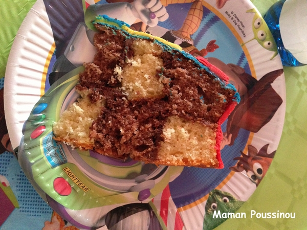 La surprise de ce gâteau c’est qu’en le coupant on découvre un gâteau damier, idée trouvée ici. Ce n’est pas difficile et ça a fait grande impression !!!