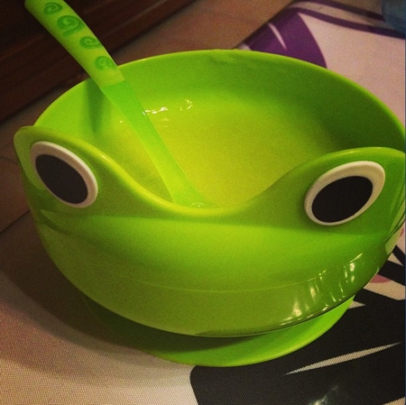 - Pour Poussinet c’était repas « vert » : purée de courgette (maison) dans bol vert grenouille