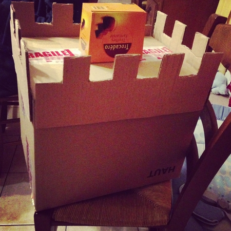 Nous avons également entrepris la construction d’un château fort avec du matériel de récupération (carton, rouleaux de papier WC,…). Je vous mettrai le tuto si nous arrivons un jour au bout parce que Poussin passe le plus clair de son temps à jouer avec plutôt que de continuer à le monter…